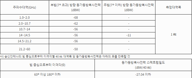 Dung sai tần số phải tuân thủ các điều kiện quy định tại Điều 5 của Quy định về Đài phát thanh. Ở trạng thái không truyền (trạng thái vô hiệu hóa truyền sóng mang), mật độ phổ công suất bức xạ đẳng hướng tương đương của bức xạ sóng vô tuyến đi kèm không được vượt quá các giá trị được liệt kê trong bảng sau.