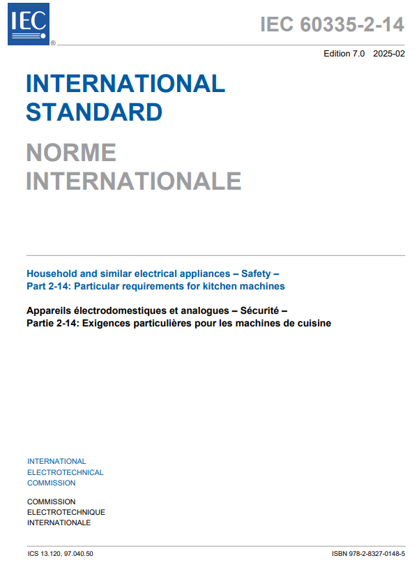 Tiêu chuẩn mới nhất(Vào ngày 7 tháng 2 năm 2025, IEC đã ban hành tiêu chuẩn an toàn cho thiết bị gia dụng - các yêu cầu cụ thể đối với thiết bị nhà bếp IEC 60335-2-14:2025!