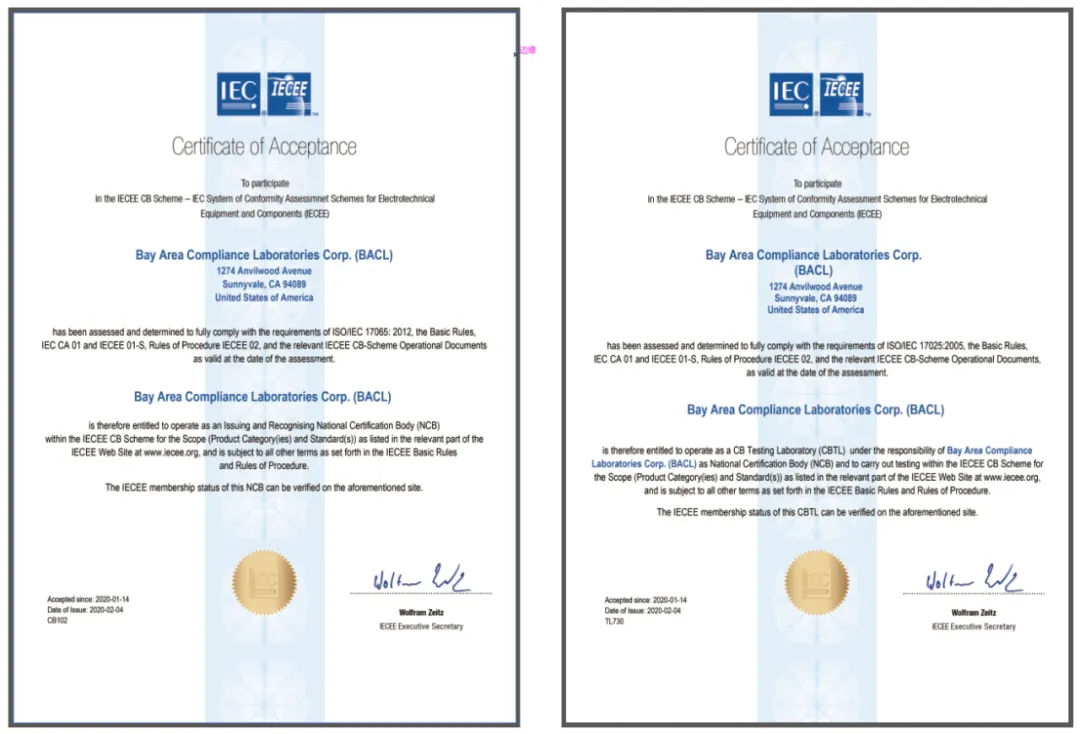 BACL là một tổ chức chứng nhận an toàn Bắc Mỹ được cả OSHA Hoa Kỳ và SCC Canada công nhận, một tổ chức được thông báo về chứng nhận CE của EU (Cơ quan được thông báo: 1313), một tổ chức chứng nhận NCB và một phòng thử nghiệm CBTL (CB102, TL730) cho Chương trình CB IECEE. BACL cũng được ủy quyền và công nhận bởi A2LA, IAS, CNAS, CMA, FDA, ACMA, SAA và các tổ chức khác. BACL có các phòng thử nghiệm an toàn tại Hoa Kỳ, Hàn Quốc, Đài Loan, Thâm Quyến, Phúc Điền và Nam Sơn, Đông Quan, Thành Đô, Côn Sơn và các nơi khác. Nó có thể cung cấp cho bạn các chứng chỉ toàn cầu về CNTT/AV, HOUS, sản phẩm chiếu sáng, sản phẩm điện, dụng cụ điện và các sản phẩm khác, bao gồm: Hoa Kỳ (NRTL, FCC, ENERGY STAR, FDA, DOE, CEC), Canada (SCC, ISED, NRCan), Liên minh Châu Âu (CE), Hàn Quốc (KC), Liên minh Châu Âu CE NB, Ủy ban Kỹ thuật Điện quốc tế IECEE CB Scheme, Nhật Bản (MIC), Singapore (IMDA), Hồng Kông (OFCA), Đài Loan (NCC, BSMI), Dịch vụ chứng nhận tại Ai Cập (NTRA, GOEIC), Việt Nam (MIC), Ả Rập Xê Út (SASO), Philippines (NTC), Thái Lan (NBTC), Malaysia (SIRIM), Ấn Độ (BIS, WPC, TEC) và các quốc gia và khu vực khác đảm bảo rằng sản phẩm của bạn có thể dễ dàng thâm nhập vào thị trường thương mại quốc tế ngay cả khi các rào cản thương mại quốc tế ngày càng trở nên khốc liệt!