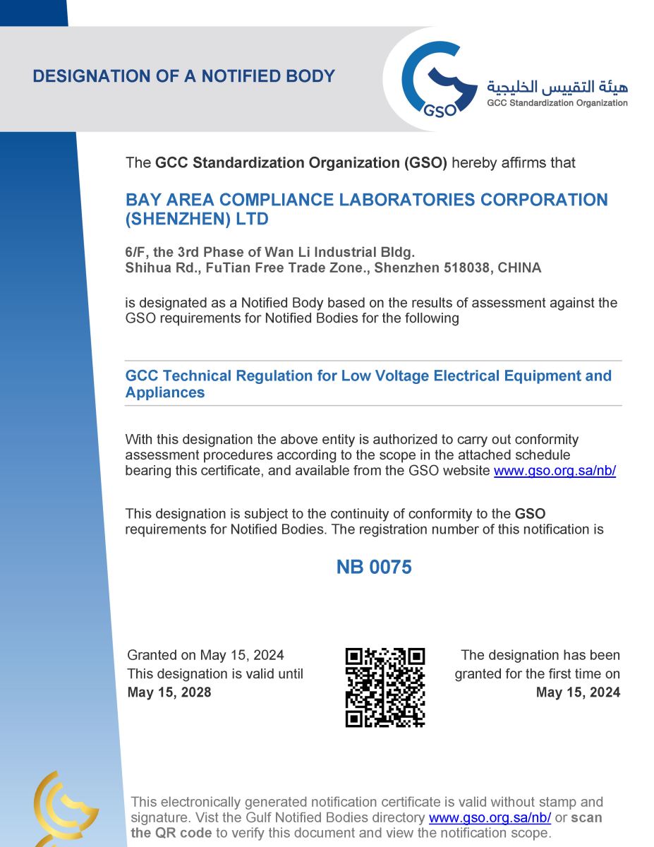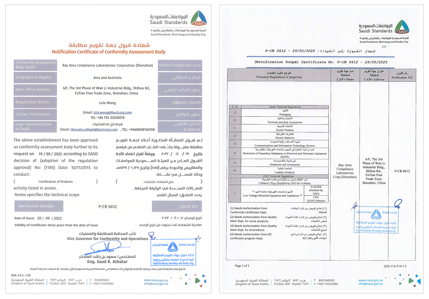 Đồng thời, BACL cũng là Cơ quan Thông báo NB được GSO công nhận và là cơ quan chứng nhận được SASO chính thức công nhận. BACL có thể cung cấp dịch vụ chứng nhận SASO cho các sản phẩm LVE và cấp chứng nhận G-Mark cho khách hàng. Chúng tôi có kinh nghiệm dày dặn trong lĩnh vực kiểm toán và cấp chứng nhận tại Trung Đông, có thể giúp bạn xin chứng nhận để xuất khẩu hàng hóa sang Trung Đông và mở rộng thị trường Trung Đông một cách hiệu quả.